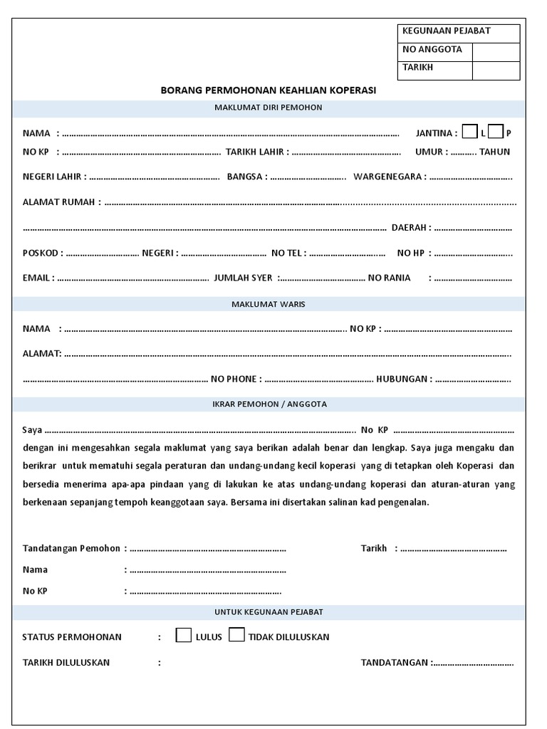 Borang Berhenti Ahli Koperasi Kowaja MOshims. Keanggotaan Koperasi ini terbuka kepada -. Borang Pembiayaan Berpenjamin Koperasi Unikeb Berhad.